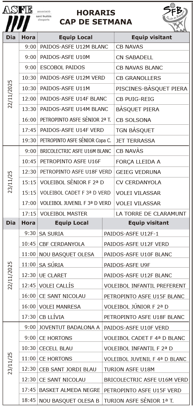 Esports ASFE: Horaris del cap de setmana 22-23 novembre Horaris asfe del cap de setmana Última actualització: 21 de novembre de 2025 13:12 ASFE Comparteix Lectura de 0 min COMPARTEIX - Anunci patrocinat - També et podria interessar Aschalew Sanmartí debuta amb la Real Balompédica Linense Sant Fruitós de Bages presenta el conte del Centenari del Futbol al municipi El santfruitosenc Ivan López, convocat amb la selecció espanyola Sub-19 David Checa guanya al circuit de Jerez Ángel Nieto Cros Escolar del Bages ETIQUETESASFEBàsquetHorarisvolei Comparteix aquest article Facebook Twitter Whatsapp Whatsapp Telegram Email Copiar enllaç Imprimir Deixar un comentari Deixar un comentari Deixa un comentari Cancel·la les respostesL'adreça electrònica no es publicarà. Els camps necessaris estan marcats amb *Comentari * Nom * Correu electrònic * Lloc web Desa el meu nom, correu electrònic i lloc web en aquest navegador per a la pròxima vegada que comenti. Segueix-nos FacebookM'agradaTwitterSeguir1.7kSeguidorsSeguir Última portada En paper i/o en digital Escull el format que més t'agradi Subscriu-te
