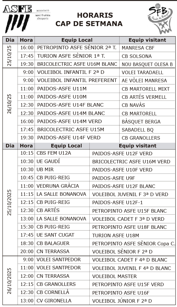 Esports ASFE: Horaris del cap de setmana 25-26 d’octubre Horaris asfe del cap de setmana Última actualització: 24 d'octubre de 2025 9:15 ASFE Comparteix Lectura de 0 min COMPARTEIX - Anunci patrocinat - També et podria interessar Crònica FUTBOL 17 d’octubre de 2025 LÍDERS! ASFE: Horaris del cap de setmana 18-19 d’octubre La santfruitosenca Paula Fernández fa història amb 200 partits a la Lliga F El jove pilot santfruitosenc Alonso Tribaldos brilla al Campionat de Catalunya de Motocròs Crònica de futbol, 10 d’octubre de 2025: COMENÇA EL GRUIX DE LLIGUES DE FUTBOL BASE ETIQUETESASFEBàsquetHorarisvolei Comparteix aquest article Facebook Twitter Whatsapp Whatsapp Telegram Email Copiar enllaç Imprimir Deixar un comentari Deixar un comentari Deixa un comentari Cancel·la les respostesL'adreça electrònica no es publicarà. Els camps necessaris estan marcats amb *Comentari * Nom * Correu electrònic * Lloc web Desa el meu nom, correu electrònic i lloc web en aquest navegador per a la pròxima vegada que comenti. Segueix-nos FacebookM'agradaTwitterSeguir1.7kSeguidorsSeguir Última portada En paper i/o en digital Escull el format que més t'agradi Subscriu-te