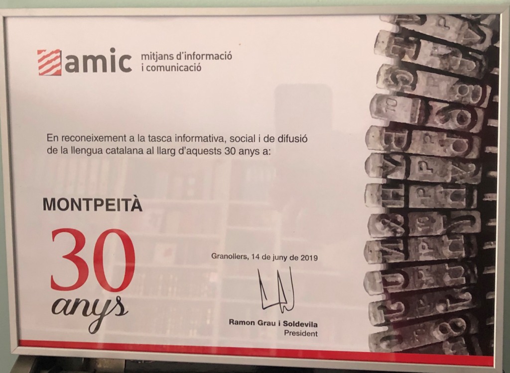 En el decurs de l’acte, l’AMIC va fer un reconeixement a les capçaleres que porten més anys al mercat, amb menció especial al Diari de Girona que celebrava 130 anys i al diari Regió 7 que en feia 40, i en el nostre cas vam tenir una agradable sorpresa no esperada, ja que l’AMIC també va voler reconèixer un mitja com el nostre, petit, local, però amb 30 anys d’existència, el nostre més sincer agraïment a l’AMIC, i el nostre més sincer reconeixement a totes aquelles persones que al llarg de tots aquests anys, han fet possible que el Montpeità continuï ben viu.