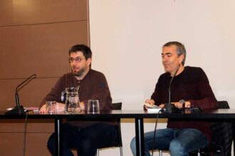 A l'Espai Òmnium de Manresa, David Clusellas acompanyat de l’escriptor Llorenç Capdeviña…