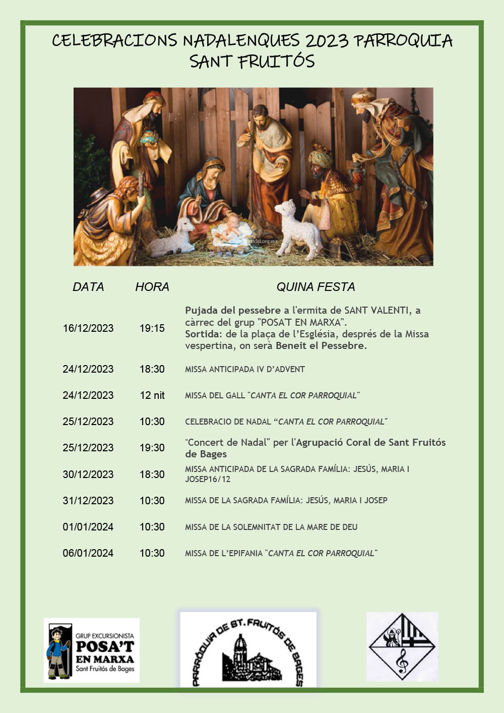 Actualitat CELEBRACIONS NADALENQUES 2023 PARROQUIA SANT FRUITÓS Última actualització: 25 de juliol de 2024 15:56 Consell parroquial de Sant Fruitós de Bages Comparteix Lectura de 0 min COMPARTEIX – També et podria interessar L’Ajuntament de Sant Fruitós de Bages i el Gobierno Autónomo Municipal de Sucre (Bolívia) signen un memoràndum d’agermanament Reparació del pontarró L’Ajuntament de Sant Fruitós de Bages organitza un taller gratuït de primers auxilis i ús de desfibril·ladors El pubillatge i l’esbart Som Riu d’Or viatgen fins a Còrsega Sant Fruitós de Bages acull la 14a Gala de les Viles Florides amb més de 300 participants Comparteix aquest article Facebook Twitter Whatsapp Whatsapp Telegram Email Copiar enllaç Imprimir Deixar un comentari Deixar un comentari Deixa un comentari Cancel·la les respostesL'adreça electrònica no es publicarà. Els camps necessaris estan marcats amb *Comentari * Nom * Correu electrònic * Lloc web Desa el meu nom, correu electrònic i lloc web en aquest navegador per a la pròxima vegada que comenti. Segueix-nos FacebookM'agradaTwitterSeguir1.7kSeguidorsSeguir Última portada En paper i/o en digital Escull el format que més t'agradi Subscriu-te