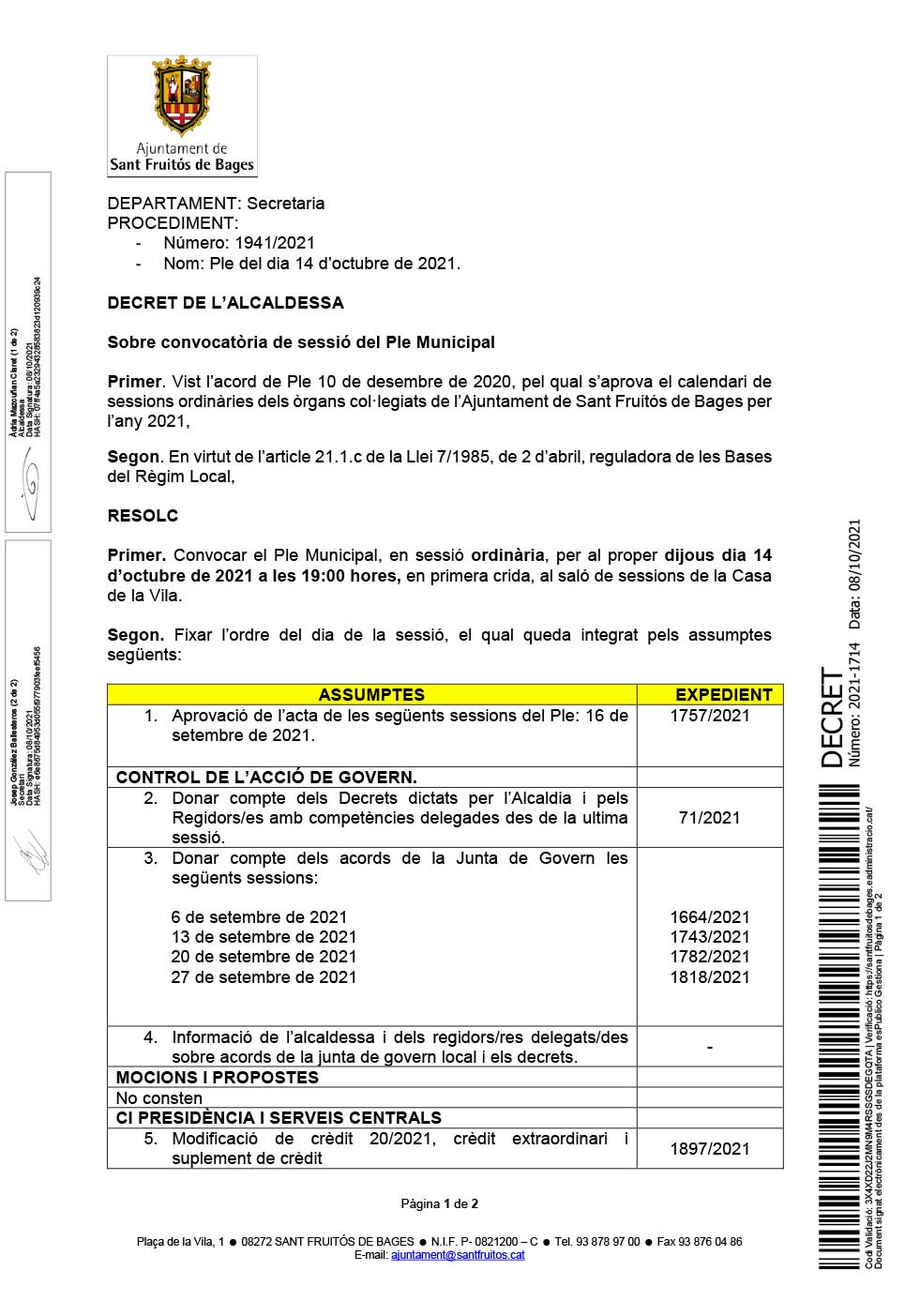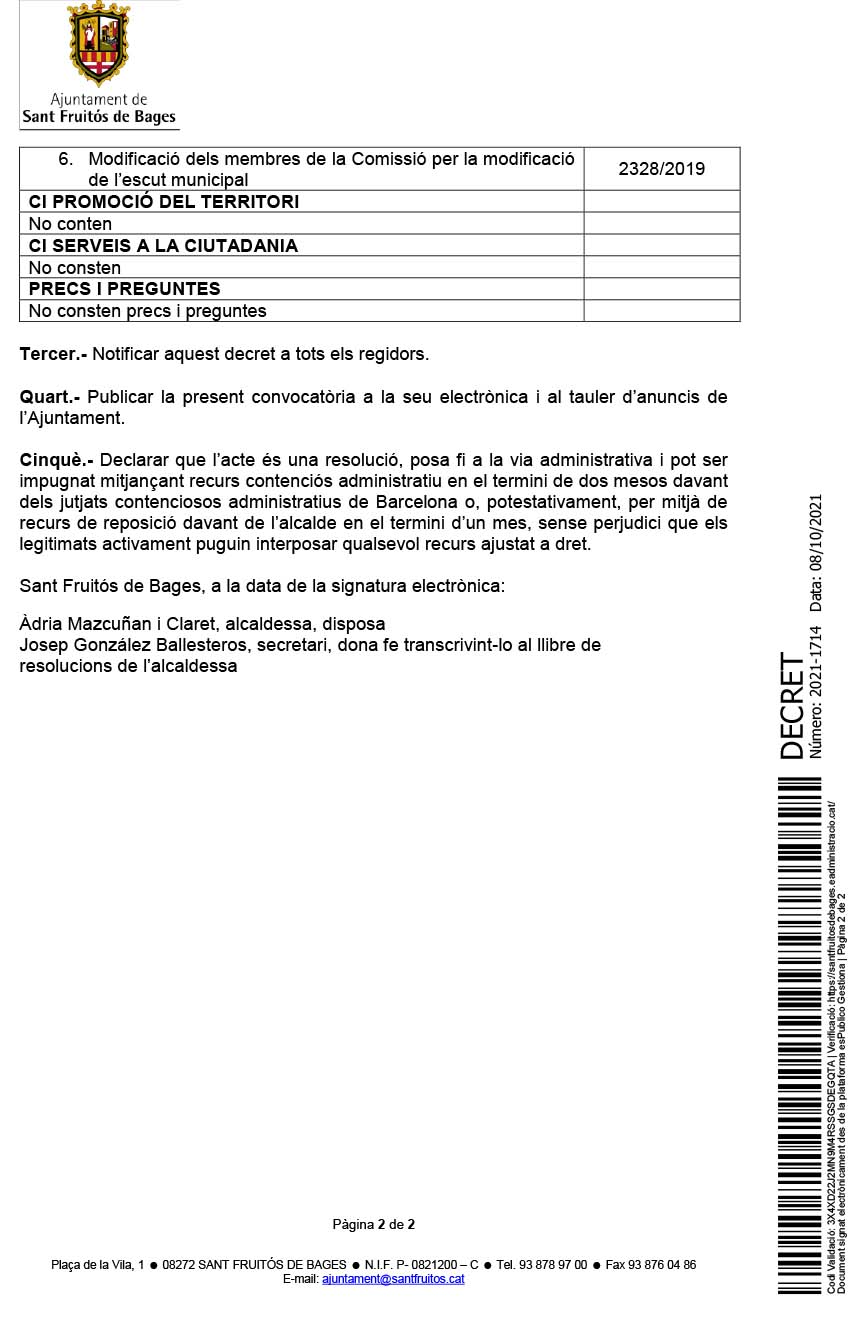 Convocatòria del proper ple municipal que es celebrarà aquest dijous 14 d’octubre a les 19 hores a la sala de plens municipal.