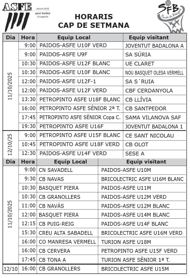 Esports Crònica Bàsquet i vòlei Sant Fruitós : Horaris del partits Horaris del partits de bàsquet i vòlei del cap de setmana Última actualització: 14 d'octubre de 2025 9:13 ASFE Comparteix Lectura de 0 min Matinals de bàsquet i vòlei ASFE COMPARTEIX - Anunci patrocinat - També et podria interessar Crònica de futbol, 10 d’octubre de 2025: COMENÇA EL GRUIX DE LLIGUES DE FUTBOL BASE Èxit de participació a la 2a edició de la Cycling Indoor de Sant Fruitós de Bages L’afinitat al Règim de Monsenyor Gibert L’Ajuntament de Sant Fruitós de Bages i el Gobierno Autónomo Municipal de Sucre (Bolívia) signen un memoràndum d’agermanament ENTREVISTES A L’ATZAR Avui: Carolina Valls ( Carnissera/Xarcutera) ETIQUETESBàsquetHorarisPartitsSant Fruitós de BagesVoleibol Comparteix aquest article Facebook Twitter Whatsapp Whatsapp Telegram Email Copiar enllaç Imprimir Deixar un comentari Deixar un comentari Deixa un comentari Cancel·la les respostesL'adreça electrònica no es publicarà. Els camps necessaris estan marcats amb *Comentari * Nom * Correu electrònic * Lloc web Desa el meu nom, correu electrònic i lloc web en aquest navegador per a la pròxima vegada que comenti. Segueix-nos FacebookM'agradaTwitterSeguir1.7kSeguidorsSeguir Última portada En paper i/o en digital Escull el format que més t'agradi Subscriu-te
