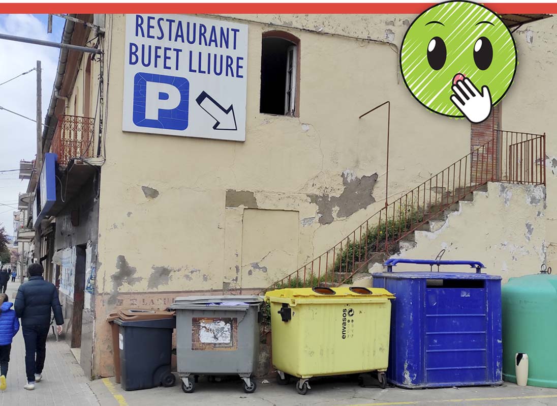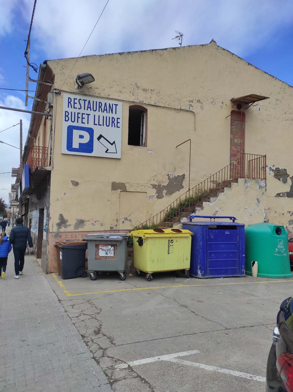 Un cartell de “Restaurant Bufet Lliure” apuntant a contenidors d’escombraries, testimoni d’un restaurant tancat fa anys. Un monument a la persistència i a les absurdes coincidències de la vida. Esperem que no sigui una profecia de Nostradamus assenyalant el que seran els futurs restaurants.