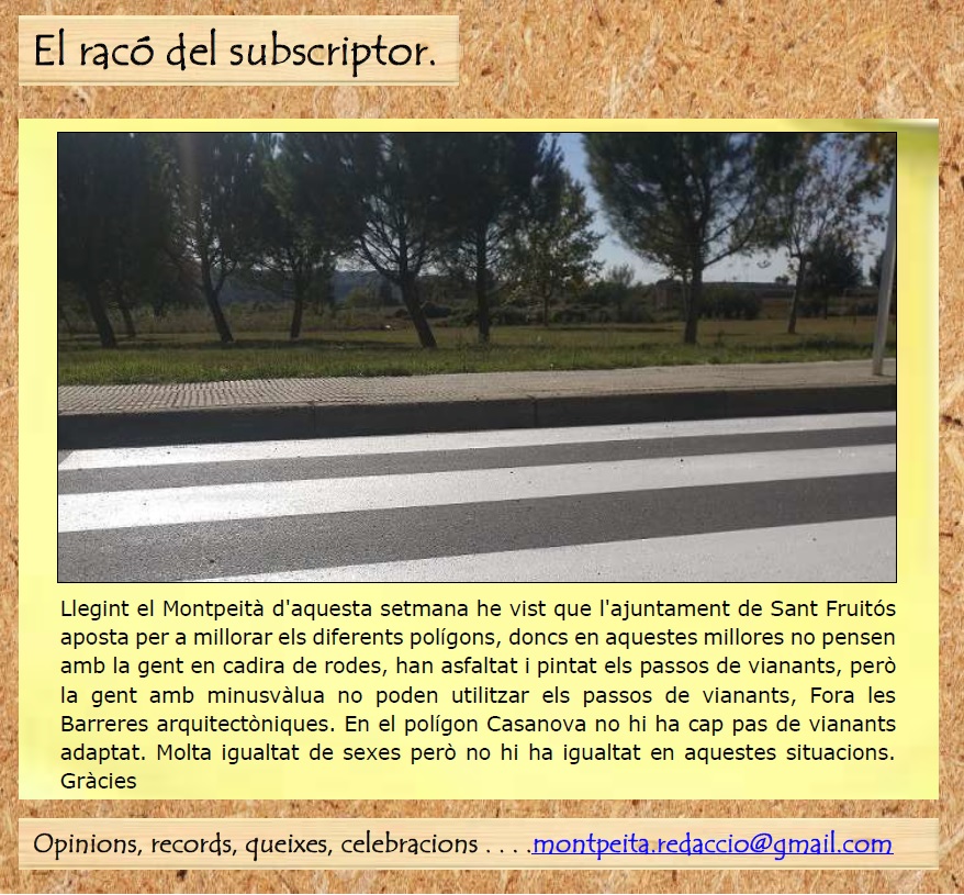 Llegint el Montpeità d’aquesta setmana he vist que l’ajuntament de Sant Fruitós aposta per a millorar els diferents polígons, doncs en aquestes millores no pensen amb la gent en cadira de rodes, han asfaltat i pintat els passos de vianants, però la gent amb minusvalia no poden utilitzar els passos de vianants.