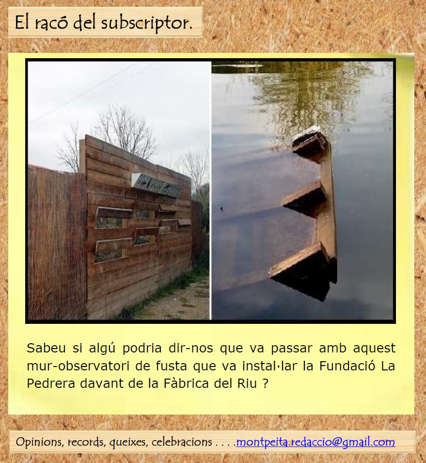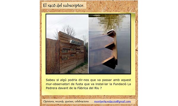 Sabeu si algu podria dir-nos que va passar  amb aquest mur-observatori de fusta que va instal·lar la Fundació La Pedrera davant de la Fàbrica del Riu