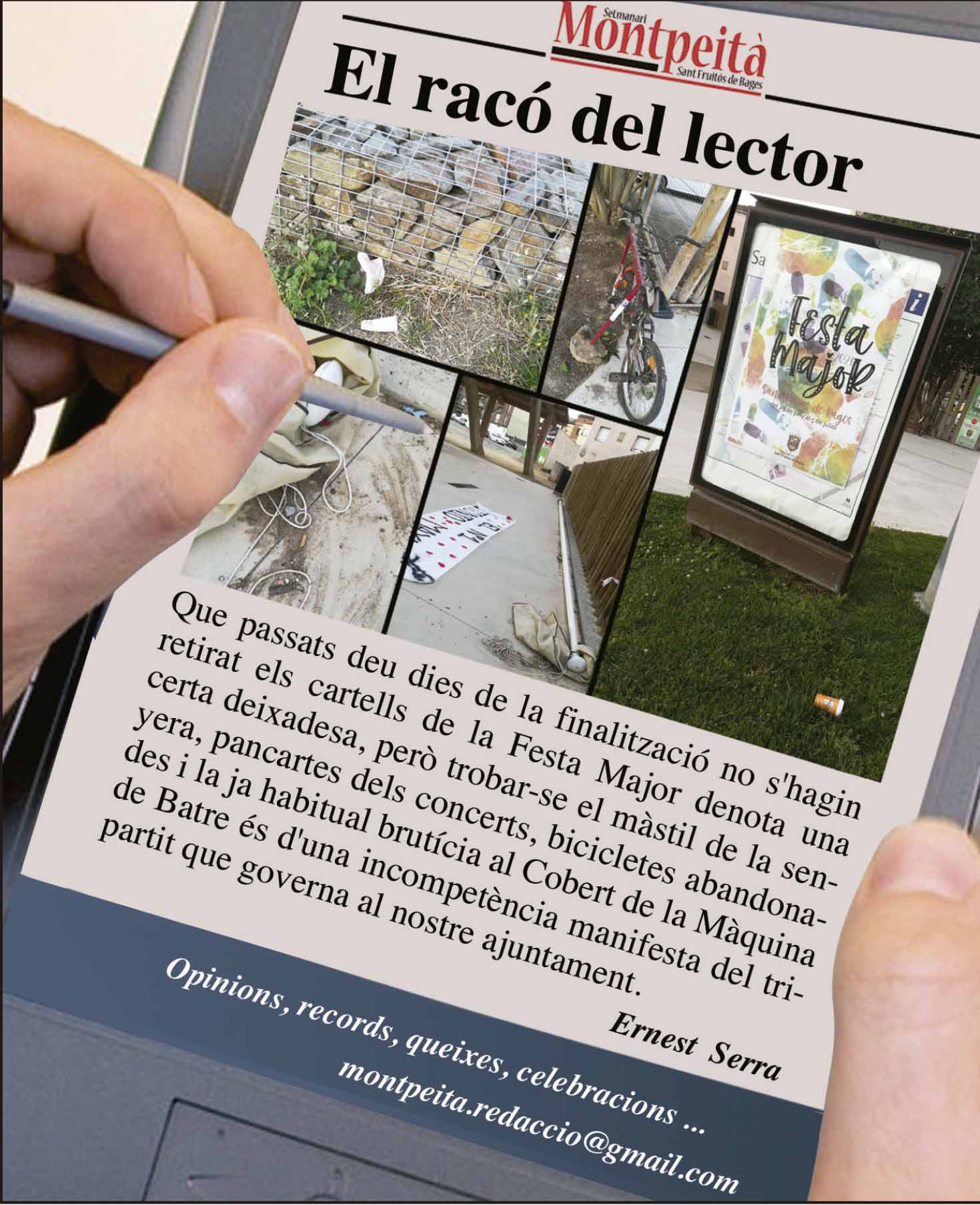 ActualitatEl racó del lector - IMATGESEl teu racóNotícies El racó del subscriptor. Deixadesa Última actualització: 25 de juliol de 2024 15:49 Redacció Comparteix Lectura de 0 min COMPARTEIX Per: Ernest Serra – - Anunci patrocinat - També et podria interessar L’Ajuntament executa tasques preventives de neteja i manteniment dels embornals i el clavegueram del municipi La Policia Local s’adhereix a la campanya del Servei Català de Trànsit per controlar bicicletes i vehicles de mobilitat personal Arriba una nova edició del “Comerç al carrer de tardor” a Sant Fruitós de Bages El festival CLAM reafirma el seu compromís amb el millor cinema i la memòria democràtica L’Ajuntament de Sant Fruitós de Bages i el Gobierno Autónomo Municipal de Sucre (Bolívia) signen un memoràndum d’agermanament ETIQUETESdeixadesaFesta MajorRaco subscriptor Comparteix aquest article Facebook Twitter Whatsapp Whatsapp Telegram Email Copiar enllaç Imprimir Deixar un comentari Deixar un comentari Deixa un comentari Cancel·la les respostesL'adreça electrònica no es publicarà. Els camps necessaris estan marcats amb *Comentari * Nom * Correu electrònic * Lloc web Desa el meu nom, correu electrònic i lloc web en aquest navegador per a la pròxima vegada que comenti. Segueix-nos FacebookM'agradaTwitterSeguir1.7kSeguidorsSeguir Última portada En paper i/o en digital Escull el format que més t'agradi Subscriu-te