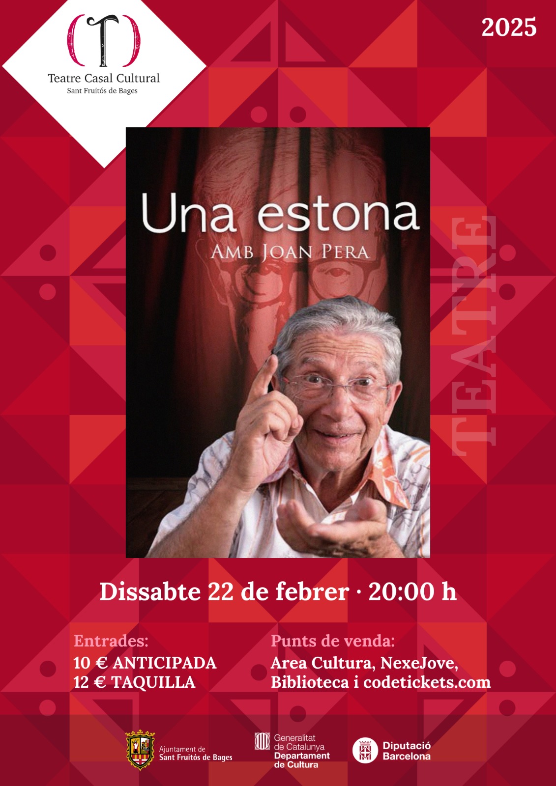 El popular actor Joan Pera porta a Sant Fruitós de Bages la funció “Una estona amb Joan Pera”.En aquest espectacle, l’actor posa en perspectiva la seva vida en un text carregat d’humor, tendre i entranyable, on desgrana el seu punt de vista murri davant tot el que l’envolta. Una mirada original i única del panorama teatral català, un veritable mite sempre vigent.