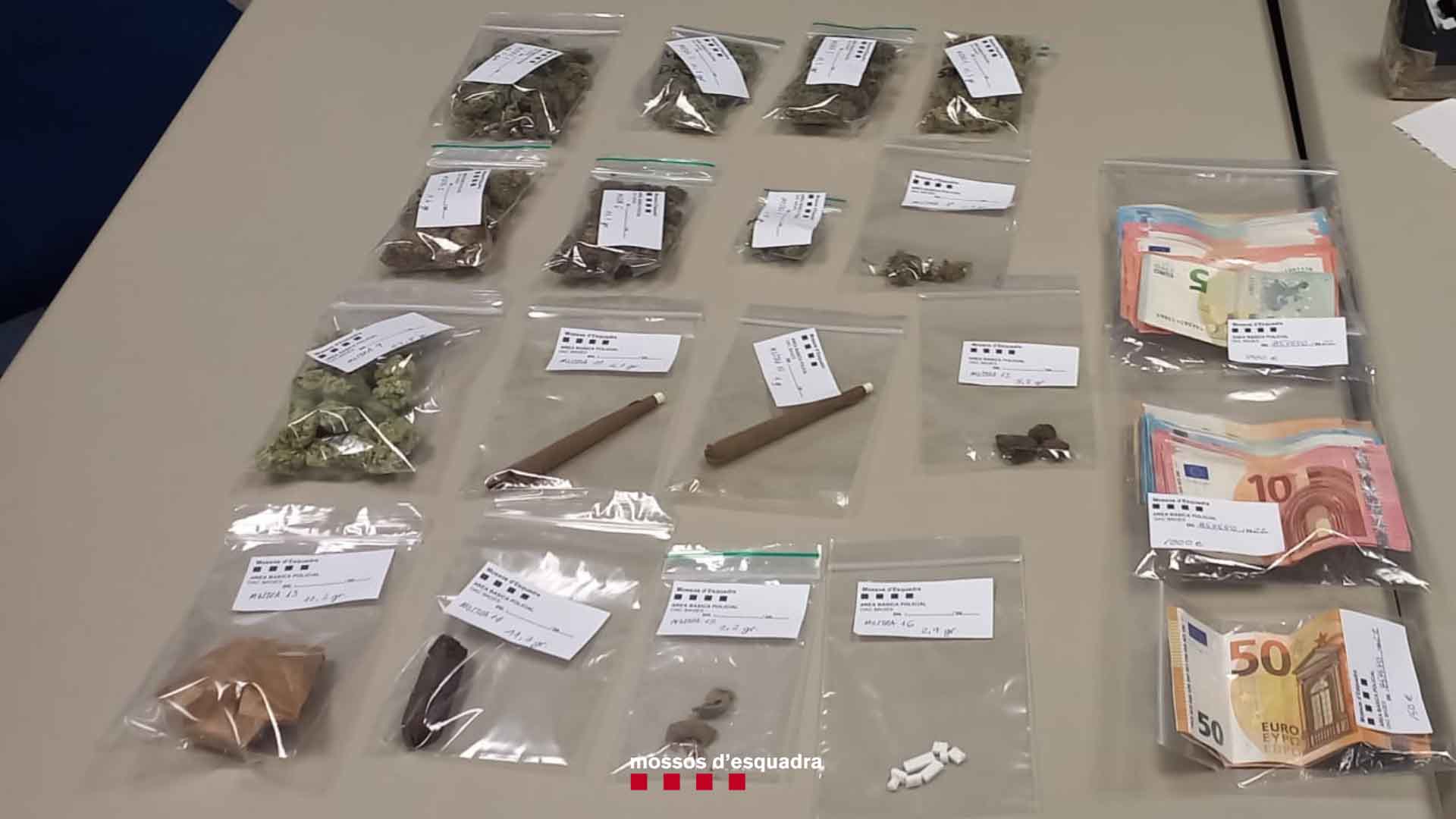 Com a resultat de l’escorcoll van localitzar diverses peces de haixix, tubs impregnats amb pols de haixix, bosses amb cabdells de marihuana i una bossa amb unes pastilles blanques. També portaven 2.090 euros en efectiu i una navalla.