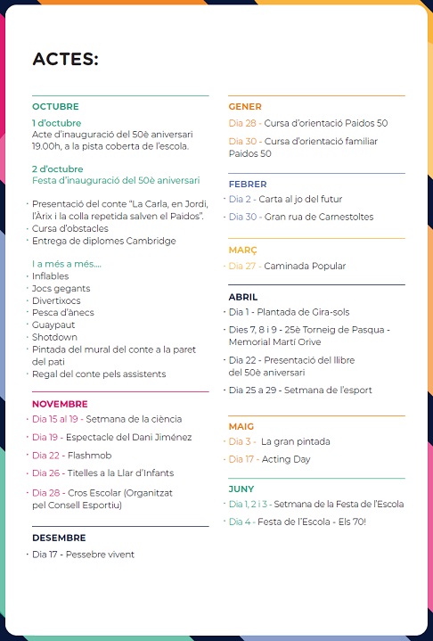 Gràcies a la visió de 5 acadèmies emprenedores que el 1971 van fer realitat aquest projecte, i a tots i totes els qui durant aquests anys hi han deixat la seva empremta, celebrem que, després de 50 anys, l’Escola Paidos és un referent de confiança en l’educació dels nens i nenes del nostre territori. Amb una identitat cooperativa que ha marcat la transformació educativa al llarg del temps de manera col·laborativa, responsable i sostenible.