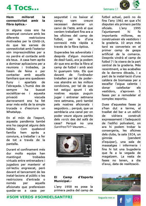 ActualitatEsportsNotícies F.C. Fruitosenc. Secció 4 Tocs Última actualització: 25 de juliol de 2024 15:48 Redacció Comparteix Lectura de 0 min COMPARTEIX Texi i fotos: SFEscolaFutbol – FC Fruitosenc - Anunci patrocinat - També et podria interessar L’Ajuntament executa tasques preventives de neteja i manteniment dels embornals i el clavegueram del municipi La Policia Local s’adhereix a la campanya del Servei Català de Trànsit per controlar bicicletes i vehicles de mobilitat personal Arriba una nova edició del “Comerç al carrer de tardor” a Sant Fruitós de Bages El festival CLAM reafirma el seu compromís amb el millor cinema i la memòria democràtica La santfruitosenca Paula Fernández fa història amb 200 partits a la Lliga F ETIQUETESescola de futbolfruitosencsom del santfrisom verds Comparteix aquest article Facebook Twitter Whatsapp Whatsapp Telegram Email Copiar enllaç Imprimir Deixar un comentari Deixar un comentari Deixa un comentari Cancel·la les respostesL'adreça electrònica no es publicarà. Els camps necessaris estan marcats amb *Comentari * Nom * Correu electrònic * Lloc web Desa el meu nom, correu electrònic i lloc web en aquest navegador per a la pròxima vegada que comenti. Segueix-nos FacebookM'agradaTwitterSeguir1.7kSeguidorsSeguir Última portada En paper i/o en digital Escull el format que més t'agradi Subscriu-te