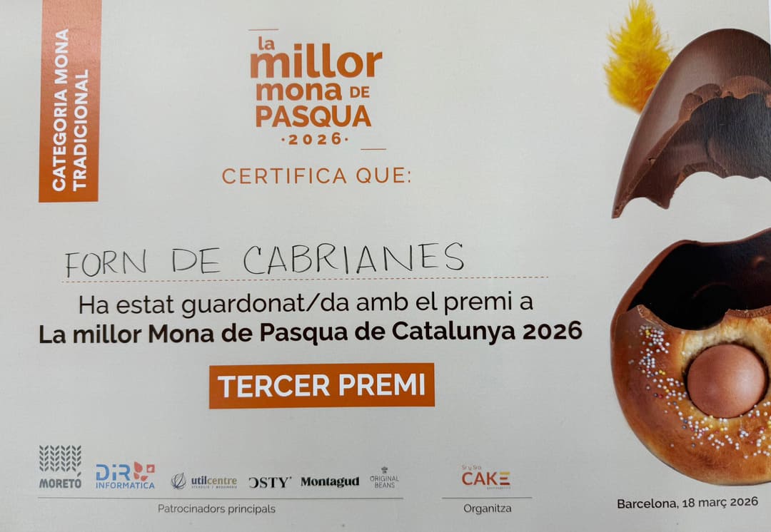 El local de Sant Fruitós de Bages, empresa arrelada al municipi i amb nom de Cabrianes, ha aconseguit una meritòria tercera posició al concurs professional “La millor Mona de Pasqua” 2026, celebrat a Barcelona i considerat un dels certàmens més rellevants del calendari gastronòmic català.