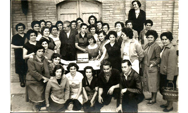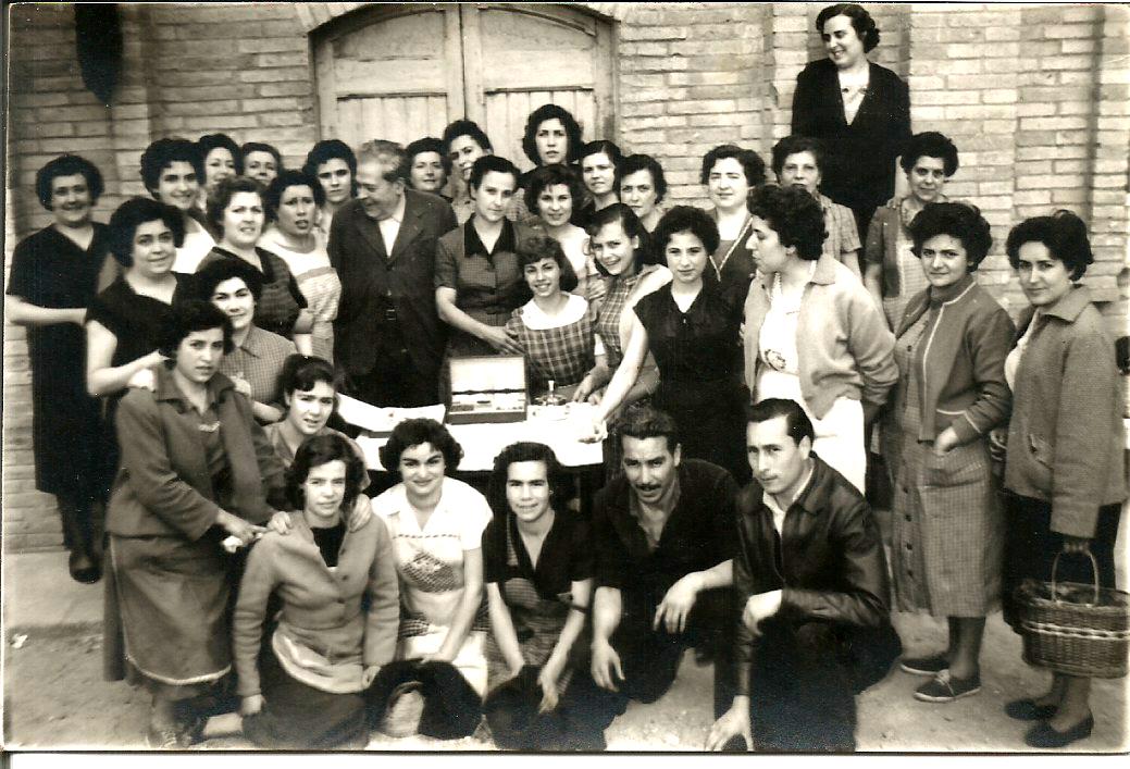 Maig del 1959. L’encarregat de la fàbrica Bertrand i Serra, Antoni Mas i Teixidor, en la diada del seu acomiadament amb motiu de la seva jubilació. A la foto, acompanyat de treballadores i treballadors de la industria tèxtil.