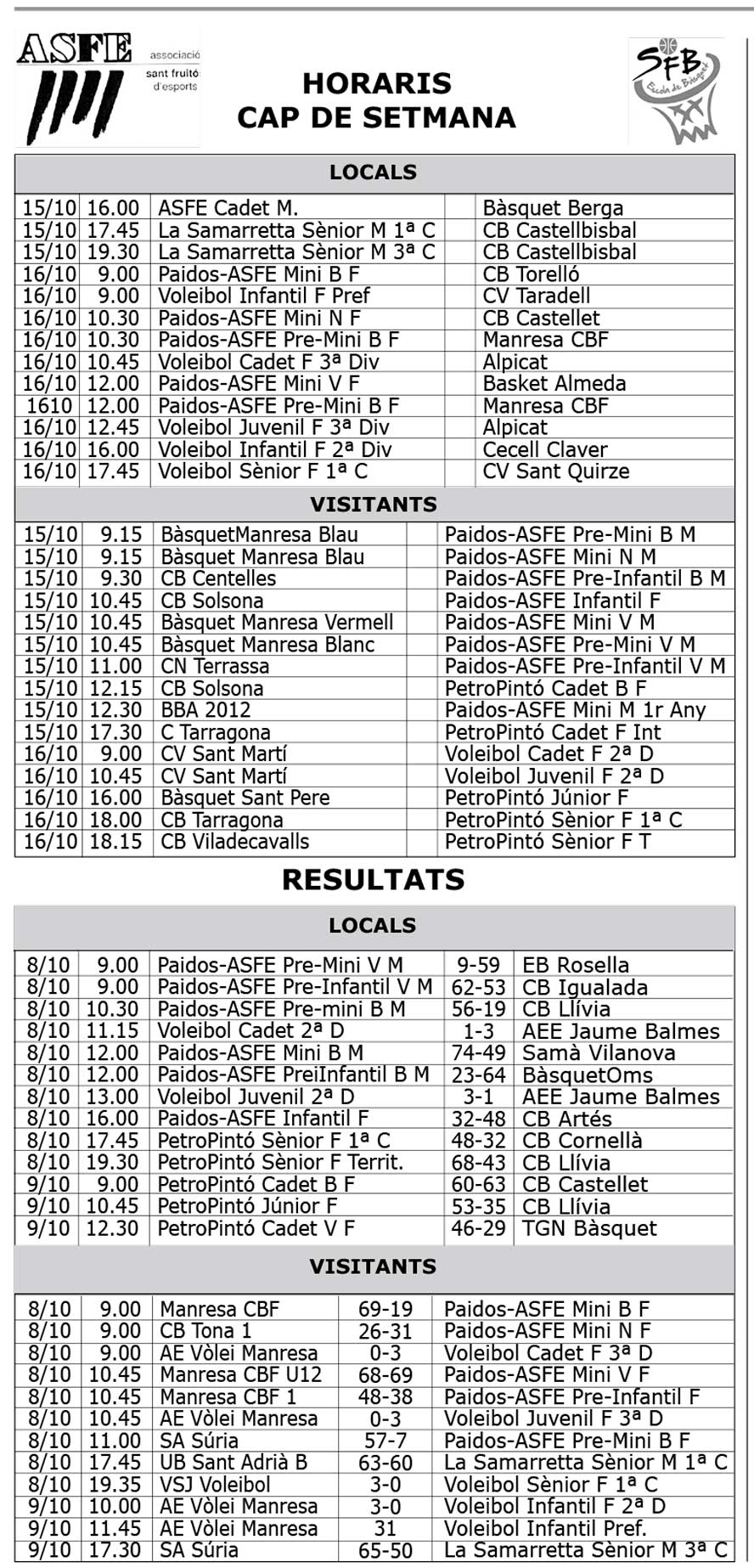 ActualitatEsports Horaris ASFE del cap de setmana Última actualització: 25 de juliol de 2024 15:53 ASFE Comparteix Lectura de 0 min COMPARTEIX - Anunci patrocinat - També et podria interessar El jove pilot santfruitosenc Alonso Tribaldos brilla al Campionat de Catalunya de Motocròs Crònica de futbol, 10 d’octubre de 2025: COMENÇA EL GRUIX DE LLIGUES DE FUTBOL BASE Èxit de participació a la 2a edició de la Cycling Indoor de Sant Fruitós de Bages L’Ajuntament de Sant Fruitós de Bages i el Gobierno Autónomo Municipal de Sucre (Bolívia) signen un memoràndum d’agermanament Reparació del pontarró ETIQUETESASFEHoraris Comparteix aquest article Facebook Twitter Whatsapp Whatsapp Telegram Email Copiar enllaç Imprimir Deixar un comentari Deixar un comentari Deixa un comentari Cancel·la les respostesL'adreça electrònica no es publicarà. Els camps necessaris estan marcats amb *Comentari * Nom * Correu electrònic * Lloc web Desa el meu nom, correu electrònic i lloc web en aquest navegador per a la pròxima vegada que comenti. Segueix-nos FacebookM'agradaTwitterSeguir1.7kSeguidorsSeguir Última portada En paper i/o en digital Escull el format que més t'agradi Subscriu-te