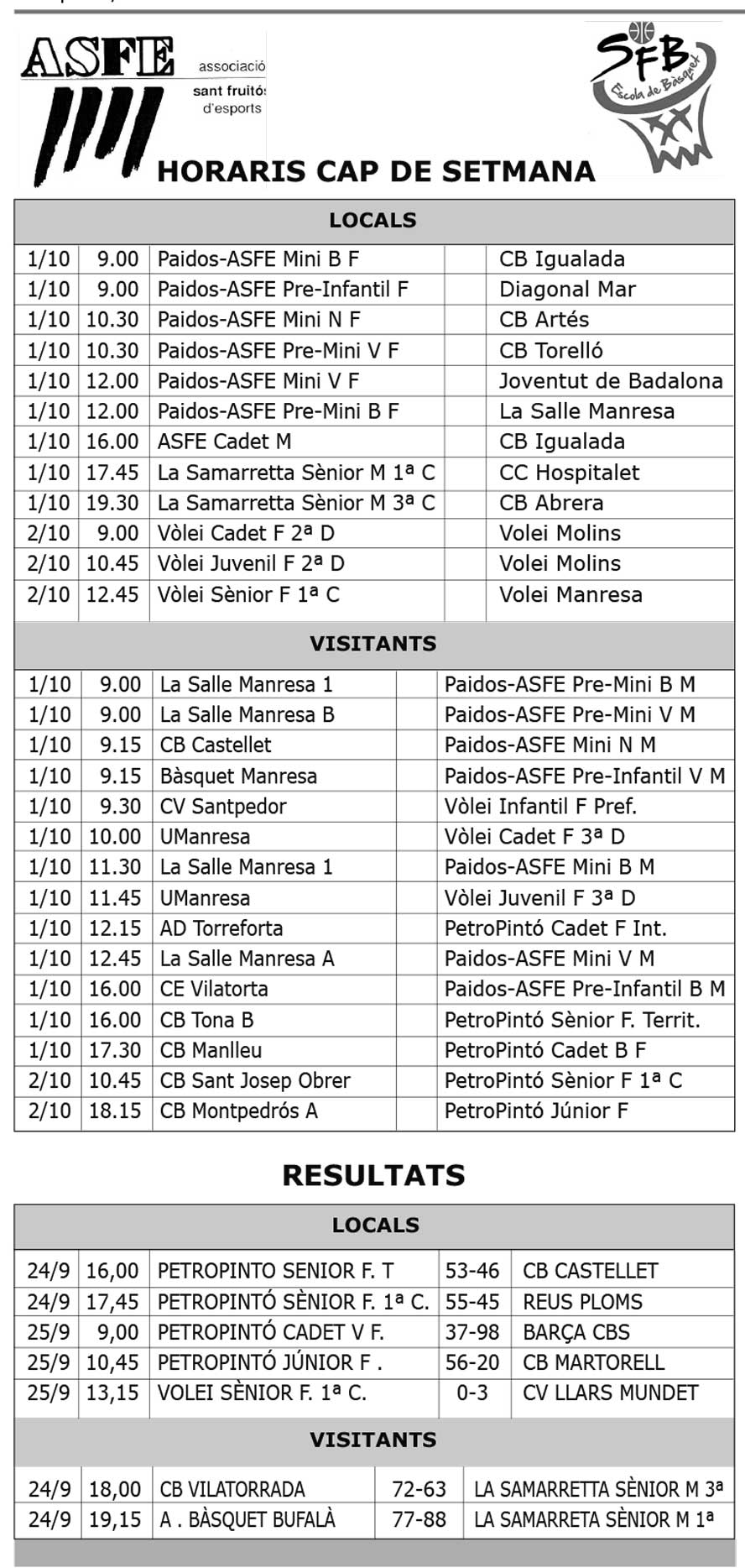 ActualitatEsports Horaris del cap de setmana Última actualització: 25 de juliol de 2024 15:53 ASFE Comparteix Lectura de 0 min COMPARTEIX - Anunci patrocinat - També et podria interessar El jove pilot santfruitosenc Alonso Tribaldos brilla al Campionat de Catalunya de Motocròs Crònica de futbol, 10 d’octubre de 2025: COMENÇA EL GRUIX DE LLIGUES DE FUTBOL BASE Èxit de participació a la 2a edició de la Cycling Indoor de Sant Fruitós de Bages L’Ajuntament de Sant Fruitós de Bages i el Gobierno Autónomo Municipal de Sucre (Bolívia) signen un memoràndum d’agermanament Reparació del pontarró ETIQUETESASFEHoraris Comparteix aquest article Facebook Twitter Whatsapp Whatsapp Telegram Email Copiar enllaç Imprimir Deixar un comentari Deixar un comentari Deixa un comentari Cancel·la les respostesL'adreça electrònica no es publicarà. Els camps necessaris estan marcats amb *Comentari * Nom * Correu electrònic * Lloc web Desa el meu nom, correu electrònic i lloc web en aquest navegador per a la pròxima vegada que comenti. Segueix-nos FacebookM'agradaTwitterSeguir1.7kSeguidorsSeguir Última portada En paper i/o en digital Escull el format que més t'agradi Subscriu-te