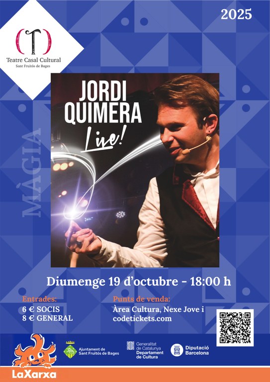 Aquest 6 diumenge, a les de la tarda, la XARXA D’ESPECTACLES FAMILIARS inaugura la seva programació 2025-26 al Casal Cultural, amb la presentació de l’espectacle de màgia Jordi Quimera Live! és una festa màgica per a tota la família! Amb gags divertidíssims, il·lusions que et deixaran bocabadat i un toc musical molt especial. Jordi Quimera ens farà passar una vetllada inoblidable.