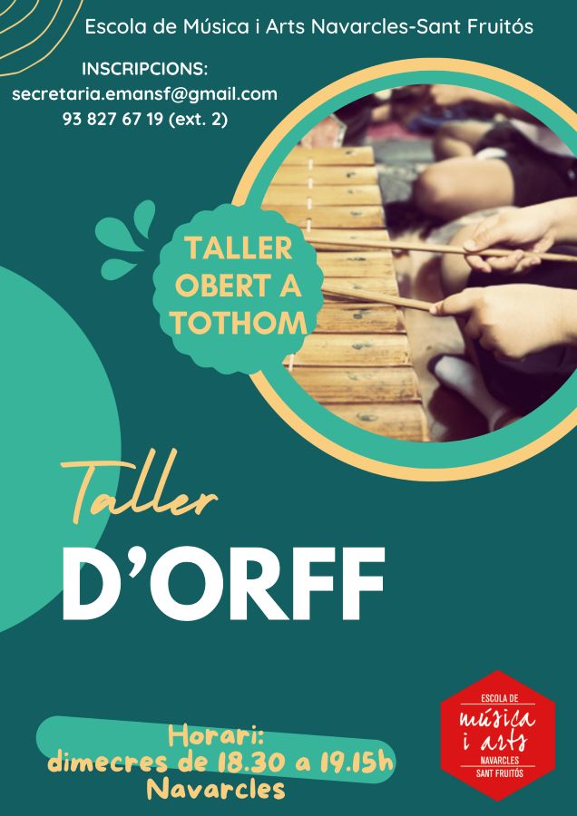 Taller Orff: el seu nom es deu al compositor Carl Orff que va iniciar una línia pedagògica per aprendre música a través dels instruments de placa (diferents tipus de xil·lòfon, de fusta i metàl·lics, per a entendre’ns).
