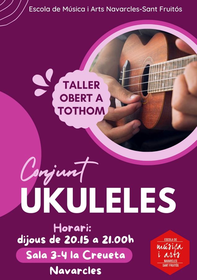 Taller d’Ukulele: aquest instrument ha adquirit una gran popularitat en els darrers anys per la seva senzillesa i efectivitat. Ja fa uns quants anys que a l’escola de música fem una assignatura setmanal on aprenem a tocar l’ukulele mentre també cantem cançons populars de tots els temps.