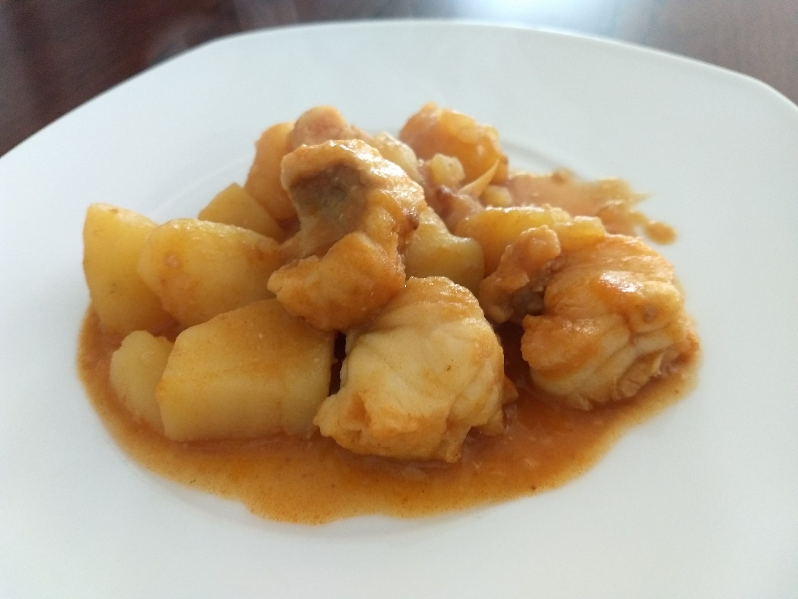 Poseu cassola al foc amb un raig l’oli i hi feu daurar els grans d’all laminats. Un pic rossets els traieu. Feu una picada amb aquets alls, el pa, les ametlles, la polpa de la nyora el safrà, fins que quedi una pasta. Talleu el bitxo a rodelles fines i el poseu a la cassola un minut. Hi aboqueu la picada i ho deixeu sofregir un parell de minuts. Poseu-hi les patates que les haurem esqueixat i les ofeguem un moment. Ho reguem amb el vi blanc i el brandi. Deixeu reduir un parell de minuts i ja hi podeu abocar el brou. No li poseu tot. Millor afegir-n’hi més endavant si convé. Feu coure cinc minuts i ja hi podeu posar els talls de rap salpebrats. Ho rectifiquem de sal, ho deixem coure deu minuts a foc baix i ho servim.