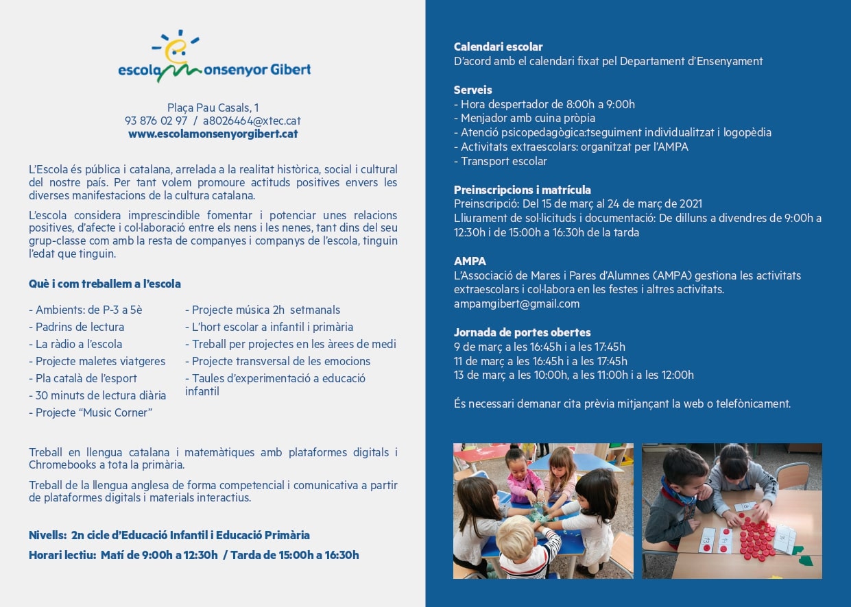 - Escola Monsenyor Gibert: 9, 11 i 13 de març – Tel. 93 876 02 97