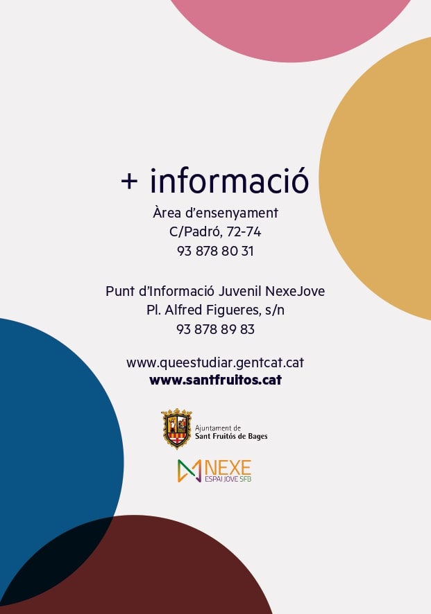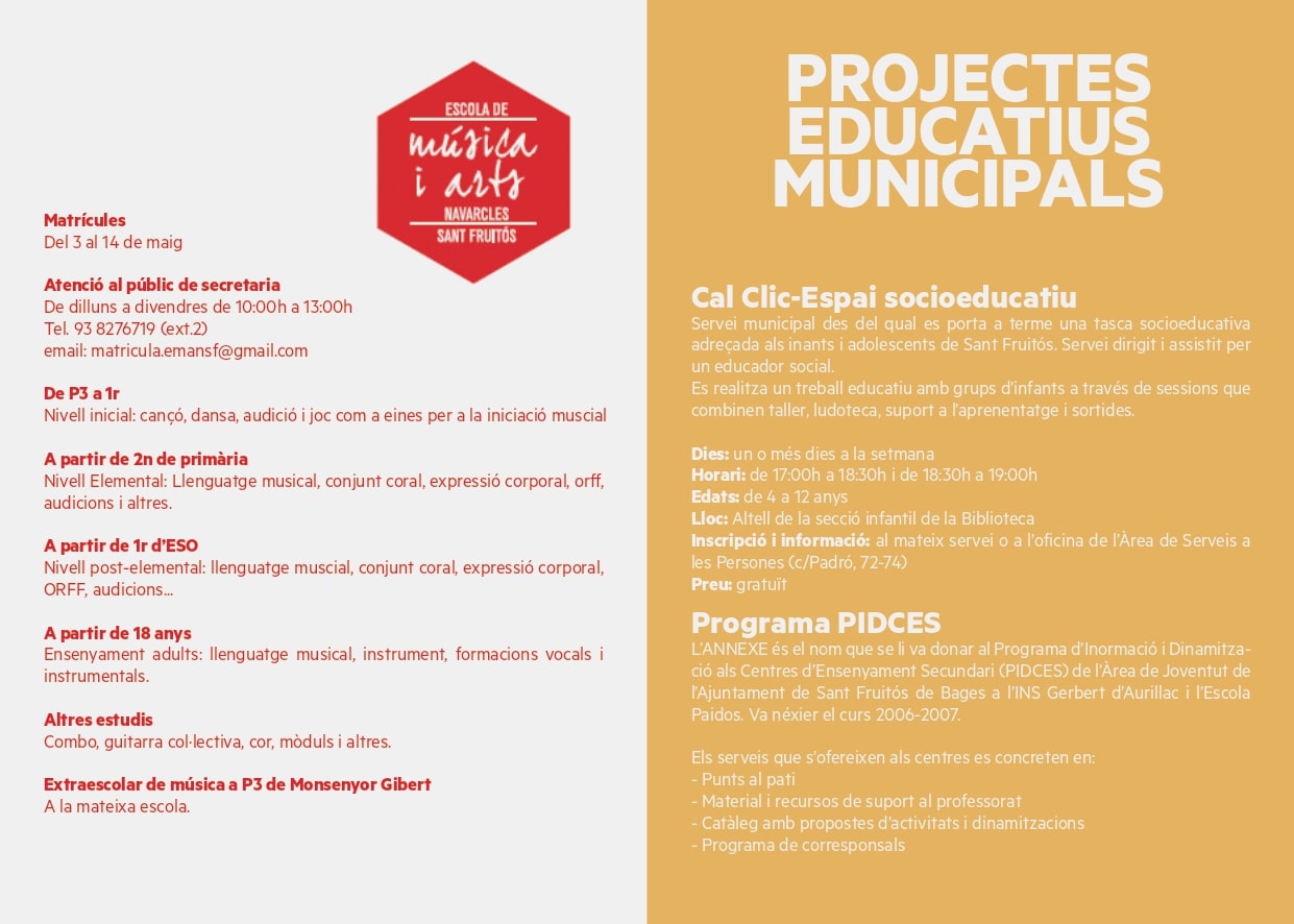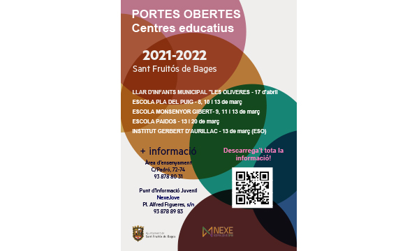 Del 8 de març al 17 d’abril, els diferents centres educatius de Sant Fruitós de Bages organitzen jornades de portes obertes per tal que les persones interessades puguin conèixer el projecte educatiu abans d’iniciar el període de preinscripcions.