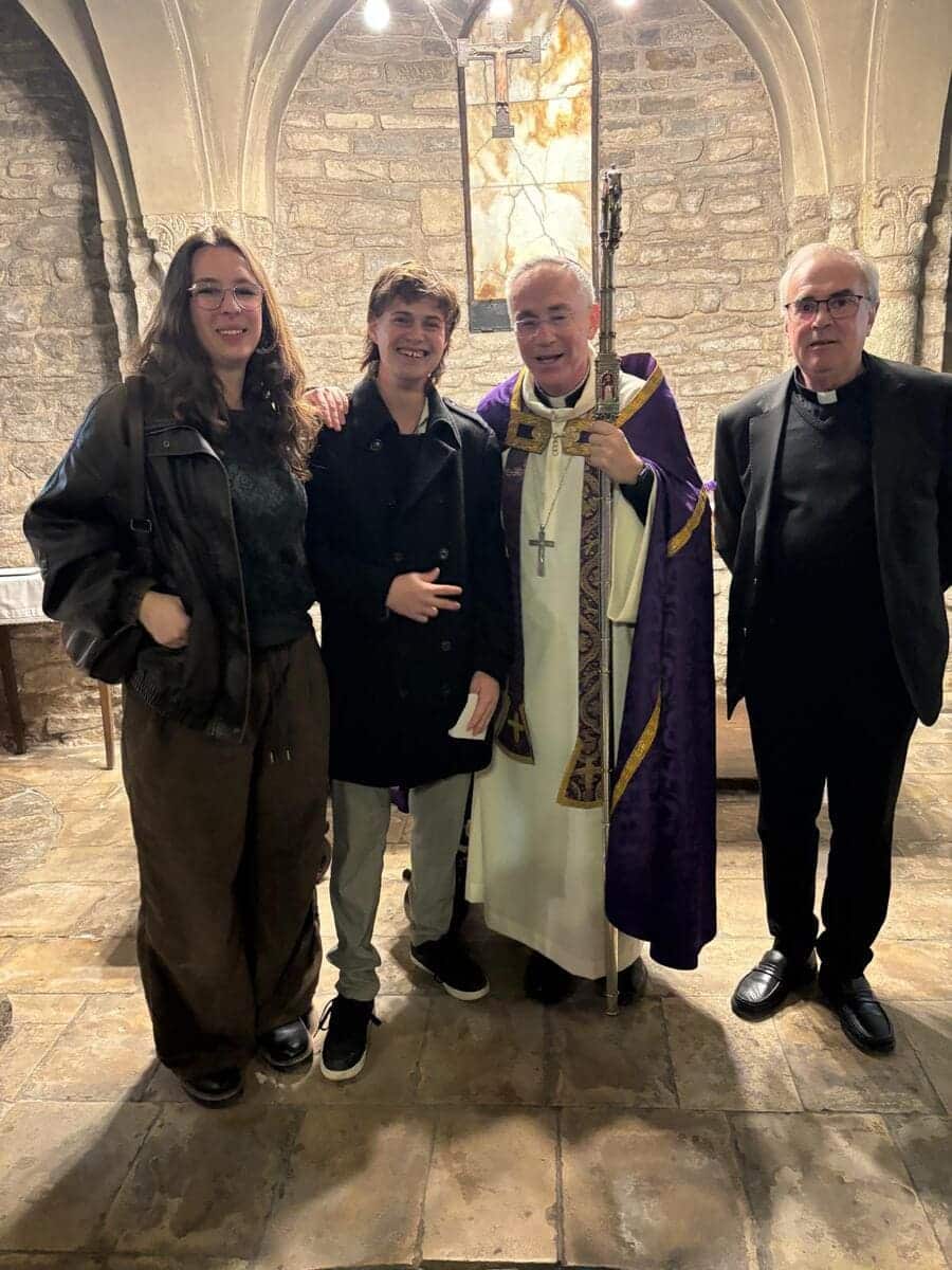 Primer van ser rebuts pel senyor bisbe Romà a la sala principal del Palau Episcopal, juntament amb altres joves i adults que també s’han preparat. Es tracta d’un espai carregat d’història, amb les imatges de tots els bisbes de Vic des de l’any 512. Tot i això, sabem que molt abans ja hi havia hagut bisbes a Vic, com ho testimonien les restes preromàniques trobades a la Catedral i que avui conformen la cripta.