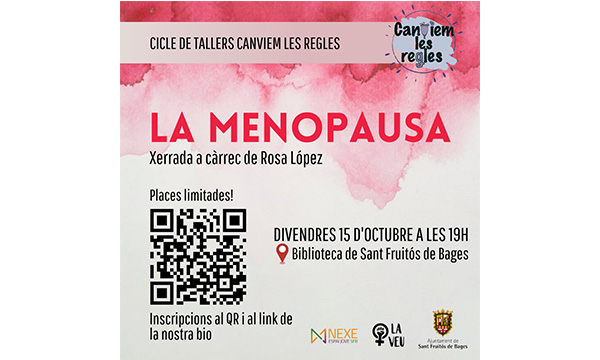 L’Ajuntament de Sant Fruitós de Bages i el col·lectiu feminista La veu, han organitzat una xerrada sobre la menopausa a càrrec de Rosa López, formada en naturopatia i quiromassatge i en l’acompanyament en els canvis cap a la menopausa.