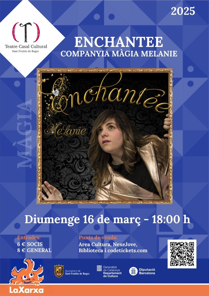L’espectacle per a públic familiar serà el diumenge 16 de març, a les 6 de la tarda, al Teatre Casal Cultural. Les entrades es poden comprar a partir de 6 euros a https://entradas.codetickets.com/entradas/xarxa-enchantee-cia-magia-melanie/64599/ajuntamentsantfruitos/online