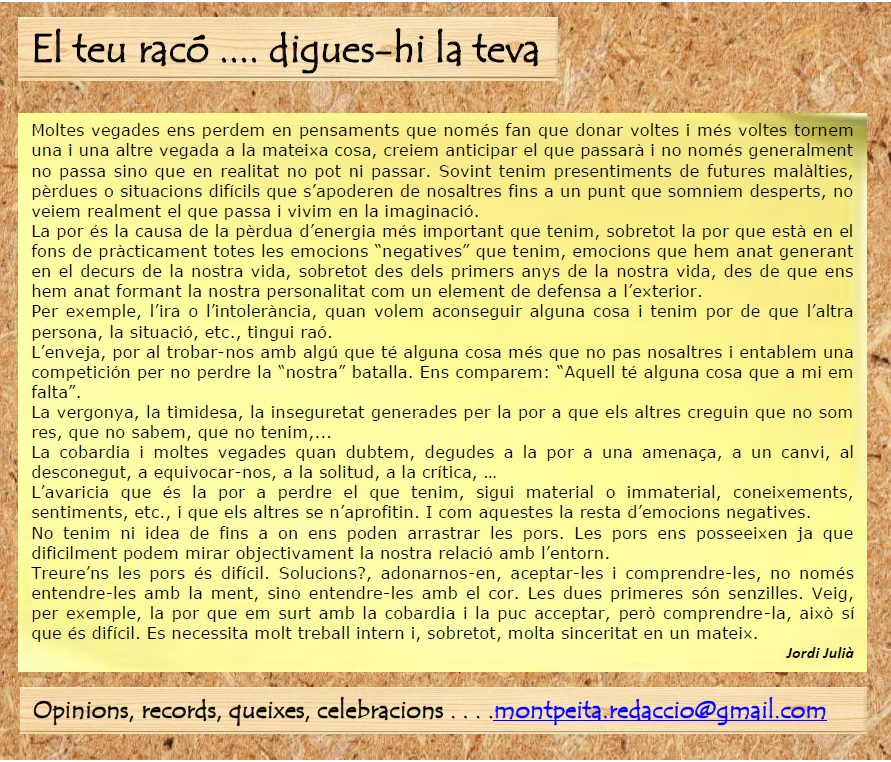 El racó del lector - IMATGESEl teu racó LA POR Última actualització: 25 de juliol de 2024 16:00 Redacció Comparteix Lectura de 0 min COMPARTEIX M. 1386 - Anunci patrocinat - També et podria interessar EL RACÓ DEL LECTOR : Un Fruitó massa amagat Racó de poesia: “SETEMBRE” de Miquel Martí Pol EL racó del lector : ” Carpes punxegudes ratllades blaves i blanques” Racó de poesia amb “Final d’estiu” de Miquel Martí i Pol Tendències de Sònia Roman: Olor de setembre ETIQUETESporracósuscriptor Comparteix aquest article Facebook Twitter Whatsapp Whatsapp Telegram Email Copiar enllaç Imprimir Deixar un comentari Deixar un comentari Deixa un comentari Cancel·la les respostesL'adreça electrònica no es publicarà. Els camps necessaris estan marcats amb *Comentari * Nom * Correu electrònic * Lloc web Desa el meu nom, correu electrònic i lloc web en aquest navegador per a la pròxima vegada que comenti. Segueix-nos FacebookM'agradaTwitterSeguir1.7kSeguidorsSeguir Última portada En paper i/o en digital Escull el format que més t'agradi Subscriu-te
