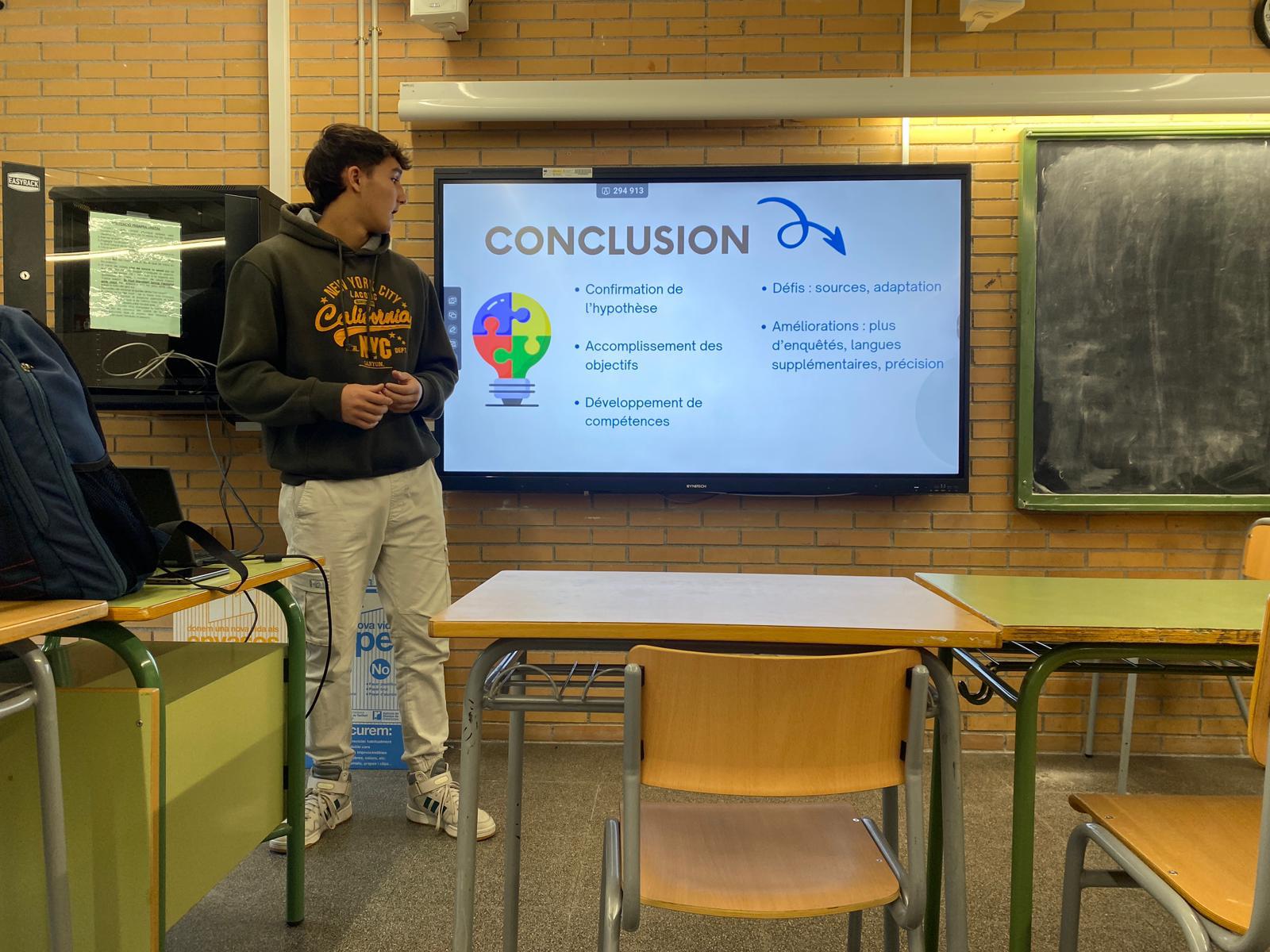 D’altra banda, tal com esmentàvem més amunt, alguns alumnes van defensar el treball de recerca en francès. És el cas, per exemple, de la Sofia Casilimas, la Jana Fernàndez i l’lsaac Singla, que cursen el programa de doble titulació batxibac. La Sofia Casilimas va analitzar les diverses branques del cristianisme i la influència que tenen en la comunitat local, en concret, al Bages. Mitjançant enquestes i entrevistes, es va proposar d’entendre com es relacionen els joves amb la seva pròpia fe, les pràctiques religioses que adopten i la participació d’aquests joves en activitats comunitàries. La recerca de la Jana Fernàndez, també defensada en francès, tenia com a objectiu principal de deixar constància de la pràcticament inexistent perspectiva de gènere en el camp de la medicina. Com en el cas de la Sofia, es va basar en entrevistes a especialistes i enquestes per concloure que no només existeix un buit en medicina pel que fa a la diferenciació entre homes i dones, sinó que va constatar que és un buit que perjudica tots dos gèneres. També, va saber aportar propostes per incloure la perspectiva de gènere en l’àmbit de la medicina. Finalment, l’Isaac Singla va comparar la interlingua, una llengua auxiliar construïda, amb el català, una llengua romànica natural, tot analitzant l’etimologia, la fonologia, el lèxic, la morfologia i la sintaxi per avaluar-ne la facilitat de comprensió i aprenentatge. Va examinar les similituds i les diferències clau i va determinar si la interlingua podria ser una llengua auxiliar internacional eficaç, especialment per als parlants de llengües romàniques.