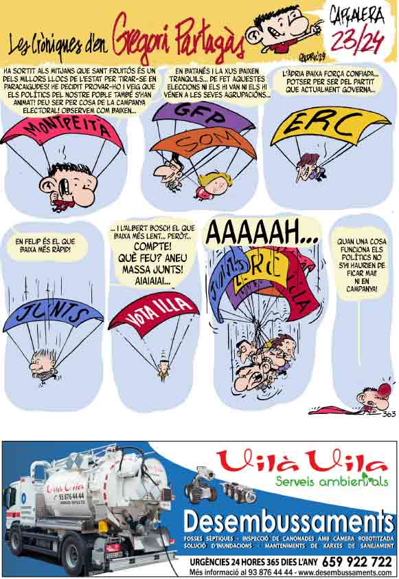 Còmic Les cròniques d’en Gregori Partagàs. Eleccions Última actualització: 25 de juliol de 2024 15:40 Redacció Comparteix Lectura de 0 min COMPARTEIX – - Anunci patrocinat - També et podria interessar Les cròniques de GREGORI PARTAGÀS Les cròniques de GREGORI PARTAGÀS Cròniques de GREGORI PARTAGAS Les cròniques de GREGORI PARTAGÀS Cròniques d’en Gregori Partagàs: Història de Sant Fruitós de Bages -Capítol 25 ETIQUETEScomicGregori Partagàs Comparteix aquest article Facebook Twitter Whatsapp Whatsapp Telegram Email Copiar enllaç Imprimir Deixar un comentari Deixar un comentari Deixa un comentari Cancel·la les respostesL'adreça electrònica no es publicarà. Els camps necessaris estan marcats amb *Comentari * Nom * Correu electrònic * Lloc web Desa el meu nom, correu electrònic i lloc web en aquest navegador per a la pròxima vegada que comenti. Segueix-nos FacebookM'agradaTwitterSeguir1.7kSeguidorsSeguir Última portada En paper i/o en digital Escull el format que més t'agradi Subscriu-te