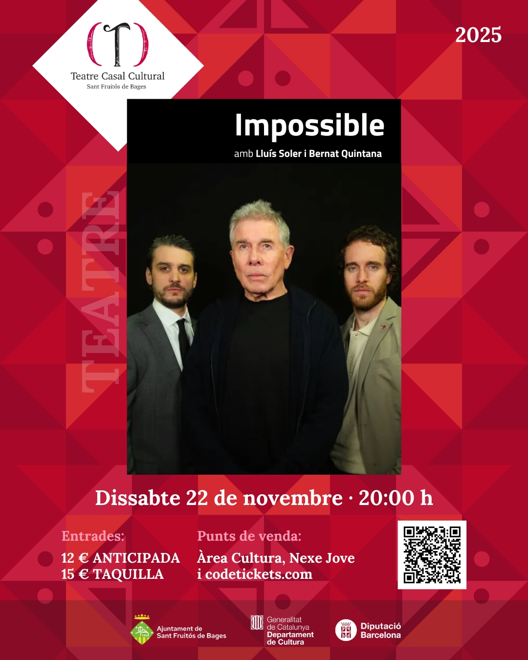 L’obra teatral “Impossible” interpretada per Lluís Soler i el santfruitosenc Bernat Quintana arriba al Teatre Casal Cultural de Sant Fruitós de Bages.