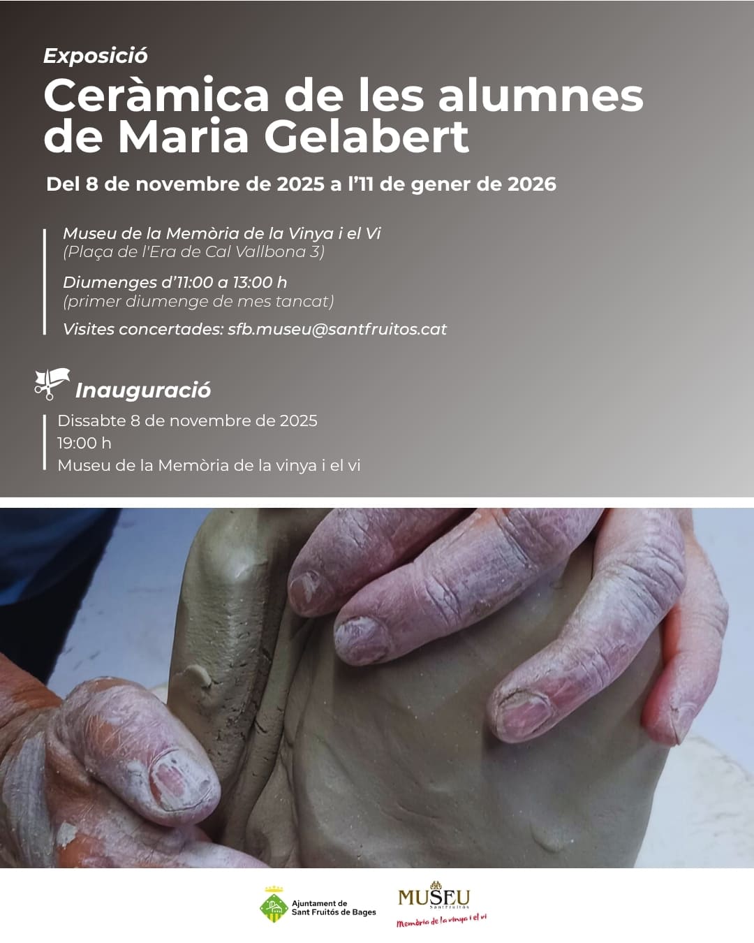 El proper dissabte 8 de novembre a les 7 de la tarda, el Museu de la Memòria de la Vinya i el Vi de Sant Fruitós de Bages acollirà la inauguració d’una mostra col·lectiva d’obres realitzades per les alumnes de la ceramista santfruitosenca Maria Gelabert.