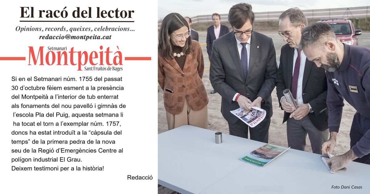 El racó del lector - IMATGES El racó del lector: El Montpeità dins la càpsula del temps d’emergències El Montpeità dins la càpsula del temps d’emergències Última actualització: 19 de novembre de 2025 10:01 Redacció Comparteix Lectura de 0 min COMPARTEIX - Anunci patrocinat - També et podria interessar Anàlisi policial de la violència masclista a Catalunya l’any 2025 Aschalew Sanmartí debuta amb la Real Balompédica Linense Clara Oliveres, la guitarrista santfruitosenca que triomfa al programa ZENIT de 3Cat ENTREVISTES A L’ATZA, Avui: Pedro Jiménez (Fotògraf) David Checa guanya al circuit de Jerez Ángel Nieto ETIQUETEScàpsula del tempshistòria localMontpeitàPortadaprimer pedraRegió d’Emergències Centre Comparteix aquest article Facebook Twitter Whatsapp Whatsapp Telegram Email Copiar enllaç Imprimir Deixar un comentari Deixar un comentari Deixa un comentari Cancel·la les respostesL'adreça electrònica no es publicarà. Els camps necessaris estan marcats amb *Comentari * Nom * Correu electrònic * Lloc web Desa el meu nom, correu electrònic i lloc web en aquest navegador per a la pròxima vegada que comenti. Segueix-nos FacebookM'agradaTwitterSeguir1.7kSeguidorsSeguir Última portada En paper i/o en digital Escull el format que més t'agradi Subscriu-te