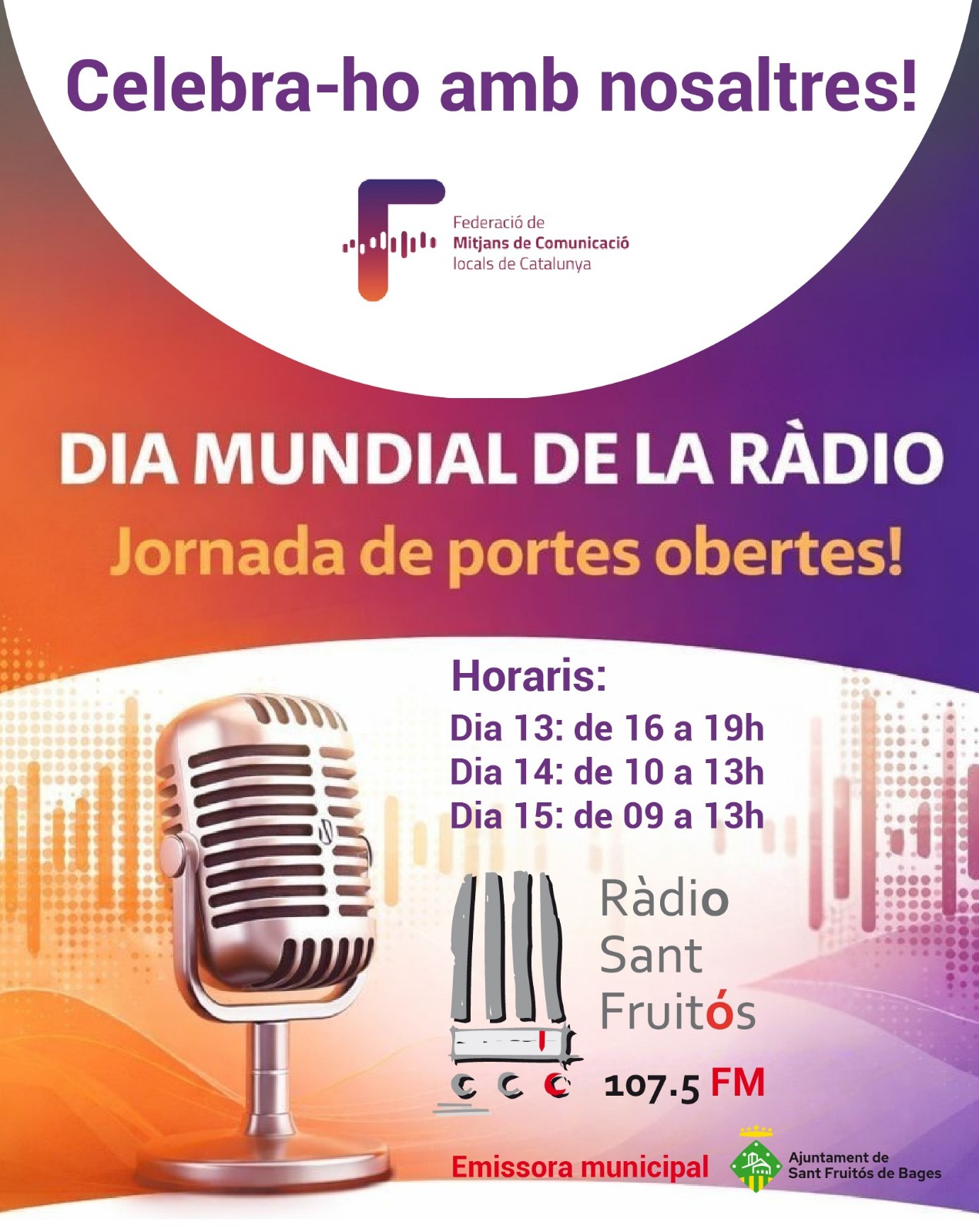 Ràdio Sant Fruitós celebrarà el Dia Mundial de la Ràdio i és per aquest motiu que les nostres instal·lacions estaran obertes al públic els dies 13/02 de 16:00 a 19:00 h, 14/02 de 10:00 a 13:00 h i el 15/02 de 09:00 a 13:00 h.