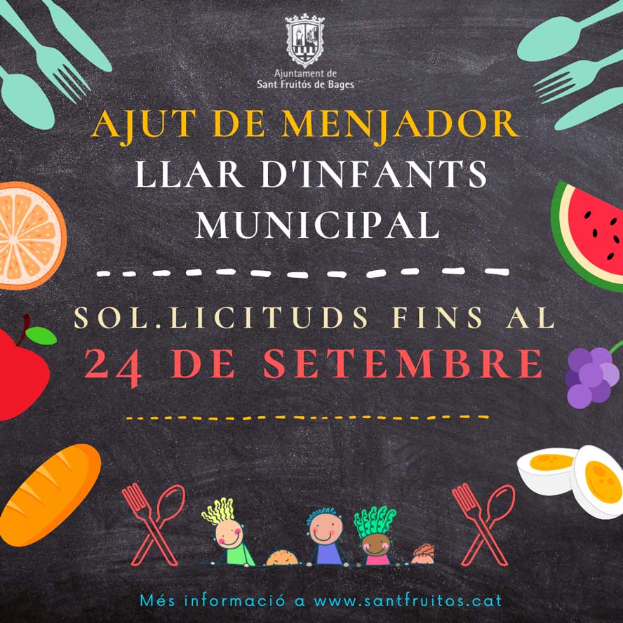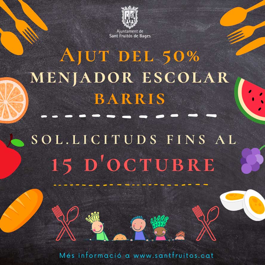 Pel que fa a l’ajut del 50% del cost del menjador escolar per aquells infants empadronats en alguna de les urbanitzacions del municipi i que estudien en centres públics del nucli, es pot sol·licitar fins al 15 d’octubre.