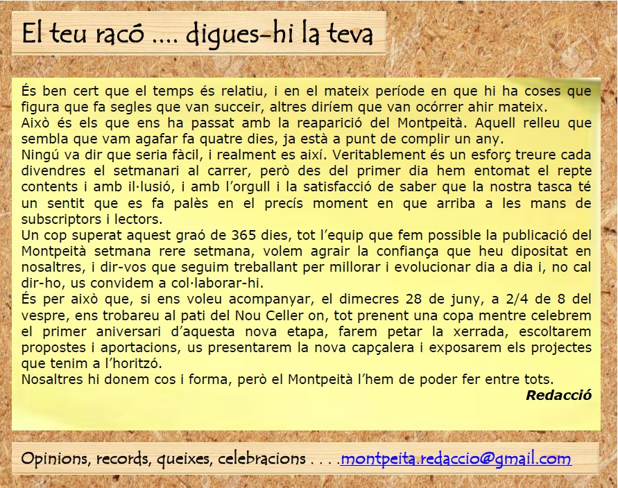 El racó del lector - IMATGESEl teu racó Primer aniversari del Montpeità Última actualització: 25 de juliol de 2024 16:00 Redacció Comparteix Lectura de 0 min COMPARTEIX M. 1373 - Anunci patrocinat - També et podria interessar EL RACÓ DEL LECTOR : Un Fruitó massa amagat Racó de poesia: “SETEMBRE” de Miquel Martí Pol EL racó del lector : ” Carpes punxegudes ratllades blaves i blanques” Racó de poesia amb “Final d’estiu” de Miquel Martí i Pol Tendències de Sònia Roman: Olor de setembre ETIQUETESaniversariracósuscriptor Comparteix aquest article Facebook Twitter Whatsapp Whatsapp Telegram Email Copiar enllaç Imprimir Deixar un comentari Deixar un comentari Deixa un comentari Cancel·la les respostesL'adreça electrònica no es publicarà. Els camps necessaris estan marcats amb *Comentari * Nom * Correu electrònic * Lloc web Desa el meu nom, correu electrònic i lloc web en aquest navegador per a la pròxima vegada que comenti. Segueix-nos FacebookM'agradaTwitterSeguir1.7kSeguidorsSeguir Última portada En paper i/o en digital Escull el format que més t'agradi Subscriu-te