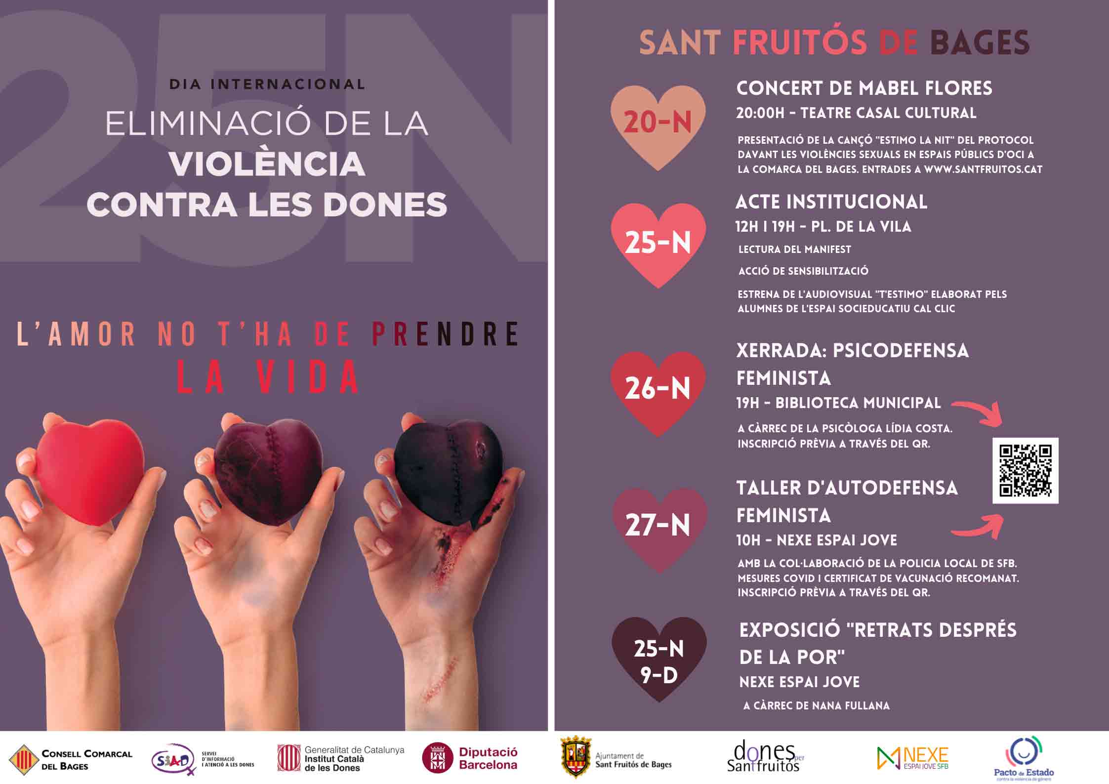 El mateix dijous 25 de novembre, a les 12 del migdia i a les 7 de la tarda, se celebrarà l’acte institucional a la plaça de la Vila amb la lectura del manifest de la jornada a càrrec de representants de l’associació Dones per Sant Fruitós. Posteriorment les assistents podran prendre part en una acció reivindicativa i veure l’estrena de l’audiovisual “T’estimo”, realitzat pels alumnes de l’aula socioeducativa del municipi, Cal Clic.