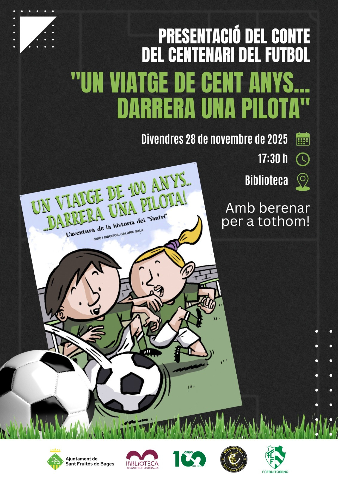 La Biblioteca de Sant Fruitós de Bages serà l’escenari de la presentació del conte “Un viatge de cent anys… darrere una pilota”, una obra escrita i il·lustrada pel santfruitosenc Galdric Sala amb motiu del centenari del futbol al municipi.