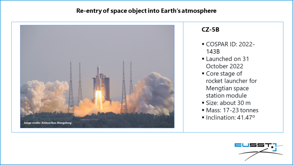 Els centres d’operacions de vigilància i seguiment de l’espai de la UE (EU SST) estan supervisant la reentrada a l’atmosfera terrestre del gran objecte espacial CZ-5B (2022-143B), l’etapa central del coet que va llançar Mengtian, el tercer mòdul de la Xina. gran estació espacial modular: el 31 d’octubre de 2022. La xarxa de sensors SST de la UE està observant l’objecte de prop i els seus radars han reduït la seva finestra de reentrada fins al 4 de novembre.