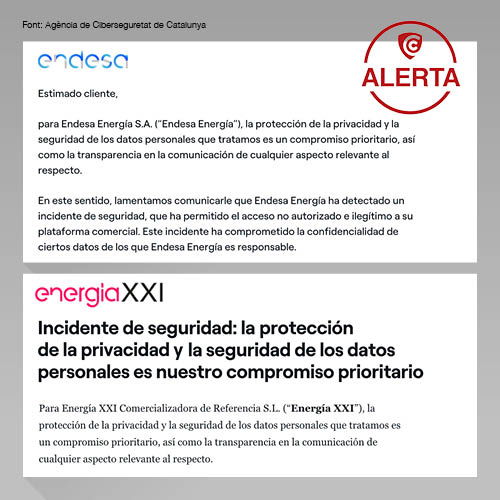 Aquesta filtració podria provocar intents de suplantació d’identitat i enviament de comunicacions fraudulentes fent-se passar per les companyies. Per això, es recomana als clients d’Endesa i Energía XII que estiguin atents davant de missatges, trucades o correus sospitosos.